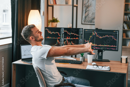 Taking a break. Young stock broker is working in the office by using computer