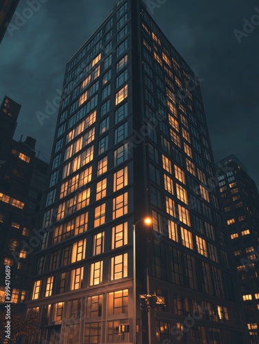 building, architecture, city landscape, urban, night, evening, late, darkness, light, illumination, window, glasses, structure, skyscraper, tower, metropolitan, downtown, metropolis, landscape