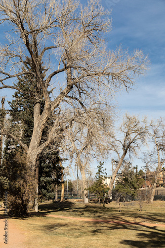 Tall Gambel Oak trees in an urban winter landscape, blue sky, vertical aspect