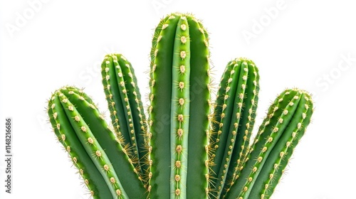 Tall green cactus with multiple segmented stems and long yellow spines against a plain white background, showcasing its unique texture and shape in a minimalistic style