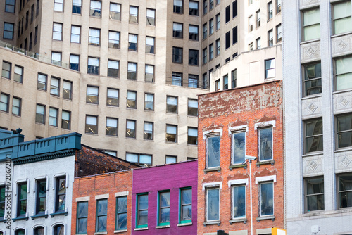 Tall historic colorful buildings in Detroit downtown, Michigan.