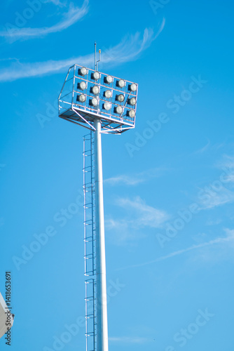 light, sky, lamp, blue, street, stadium, pole, lighting, post, cloud, light, electric, lantern, energy, lamp-post, illumination, electricity, metal, cloud, street light, power, bulb, bright, equipment, floodlight, light pole, tower, mast, clear sky, daytime, outdoors, field, arena, powerful, technology, infrastructure, structure, spotlight