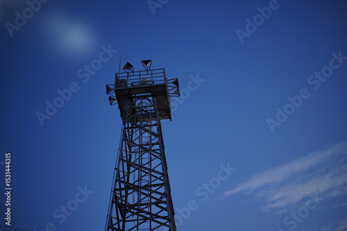 Tall Metal Tower Against a Deep Blue Sky A Striking Architectural Structure