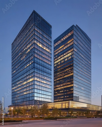 business building, illuminated, blue skies, modern architecture, tall building, skyscraper, city landscape, urban, light, evening, tower block, business district, contemporary, skyline, metropolitan, downtown, architecture, dusk, clear sky, city lights, exterior, corporate environment, bustling, urban life, city, building, office, skyscraper, glasses, business, sky, building, tower, night, street, high, new, window, finance, tall, blue, window