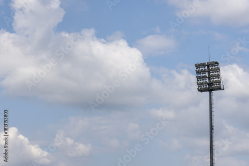 stadium, light, pole, peaceful, blue, sky, cloud, sport, field, game, quiet, daytime, illumination, background, floodlight, lamp, metal, steel, tower, fixture, lighting, high, tall, mast, weather, atmosphere, air, nature, scenic, cumulus, cloudscape, bright, electricity, power, energy, technology, equipment, sport, event, arena, venue, infrastructure, match, competition, copy space, nobody, empty, structure