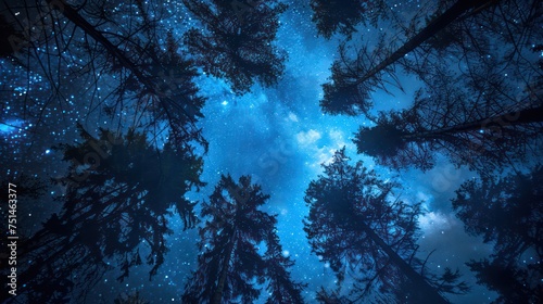 Tall trees towering alongside the dark blue sky and starry night in the forest.