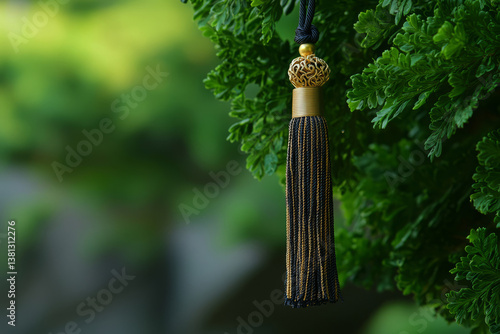 tassel, cord, thread, hanging, rope, decoration, graduation, achievement, honour, celebration, ceremony, education, outdoors, background, success, symbol, fabric, element, detail, shiny, festive, academic, natural, soft, string, classic, bokeh, bright, greenery, peaceful, leaf, traditional, smooth, elegant, student, school, moment, textile, pattern, curve, fine