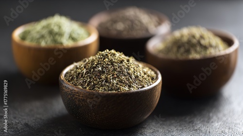taste. Artisanal collection of dried herbs and spices in wooden bowls, emphasizing natural culinary ingredients. menu design.
