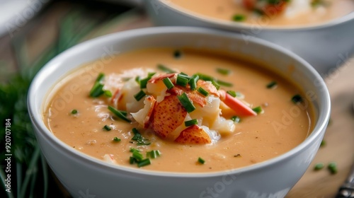 Tasting the creamy goodness of lobster bisque, garnished with a drizzle of sherry and fresh chives.