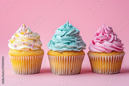 Tasty cupcakes with butter cream and sprinkles on pink background