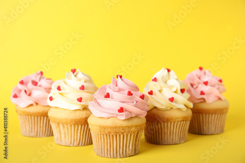 Tasty cupcakes with heart shaped sprinkles on yellow background. Valentine's Day celebration
