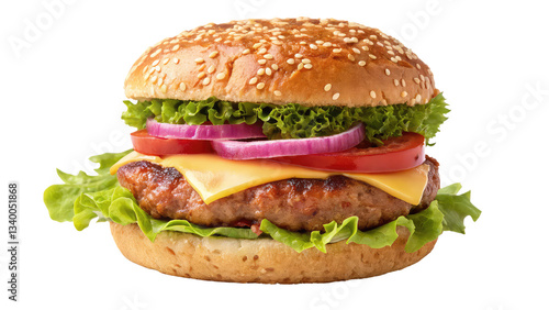 Tasty hamburger with layers of fresh ingredients including crispy lettuce, ripe tomato, melted cheese, and a perfectly cooked beef patty on transparent background PNG.