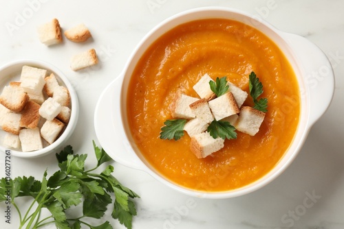Tasty pumpkin cream soup with croutons and parsley in bowl on white table, flat lay