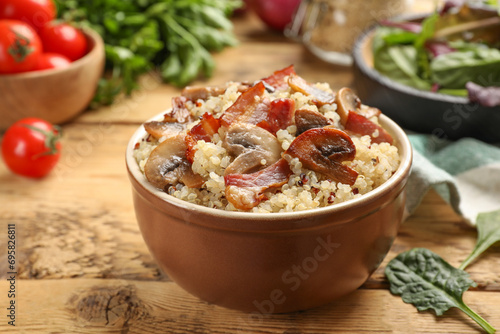 Tasty quinoa porridge with fried bacon and mushrooms in bowl on wooden table, closeup