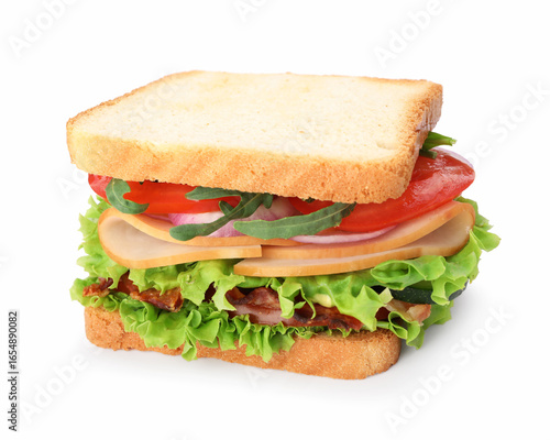 Tasty sandwich with ham, bacon and vegetables isolated on white