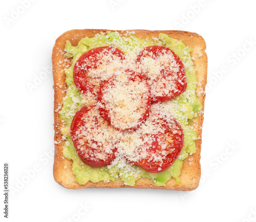 Tasty toast with avocado spread, tomato and cheese on white background, top view