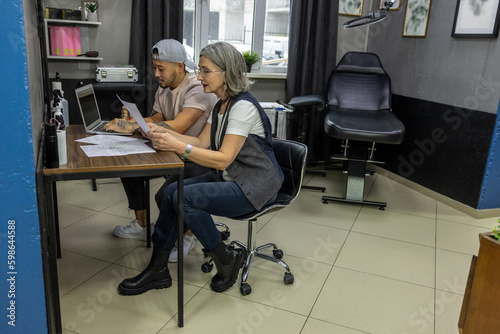 Tattoo master and a customer choosing a tattoo sketch