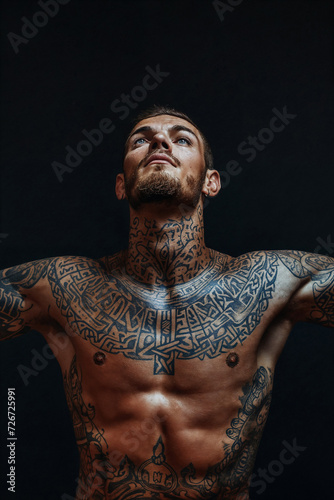 man, tattoo, body, tattooed, dark, background, art, inked, skin, shirtless, gazing, arm, upwards, portrait, design, male, detailed, tattoo, chest, neck, artistic, pose, physique, muscular, modification, cultural, expression, personal, style, black, ink, culture, canvas, pattern, intriguing, intense, stare, striking, contrast, illustration, session, daring, look, individuality, visible, enthusiast, generative, ai