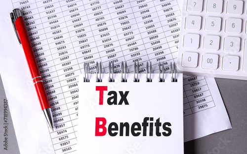 TAX BENEFITS text on notebook with pen, calculator and chart on grey background