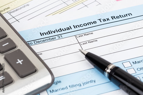 Tax form with pen and calculator; document are mock-up