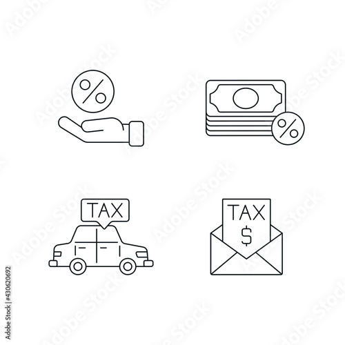 Tax Service linear icons set. Taxation. Thin line customizable illustration. Contour symbol. Vector isolated outline drawing. Editable stroke