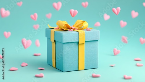 Teal gift box with yellow ribbon, falling hearts, pastel background; Valentine's Day greeting