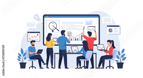 teamwork, collaboration, business, analysis, datum, screen, presentation, meeting, office, technology, laptop, tablet, chart, graph, statistic, information, research, planning, strategy, success, growth, development, marketing, finance, sale, management, project, team, people, professional, work, discussion, communication, brainstorming, idea, solution, innovation, progress, performance, result, efficiency, productivity, modern, illustration, vector, digital