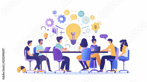 team, teamwork, brainstorming, collaboration, meeting, light bulb, idea, innovation, creativity, gear, discussion, group, office, workspace, business, concept, solution, graphic design, productivity, planning, colourful, workplace, interaction, communication, people, technology, modern, strategy, business meeting, animated, cooperation, abstract, startup