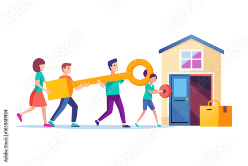 homeownership, key, house, teamwork, unlock, real estate, property, moving, new home, family, illustration, cartoon, people, carrying, success, achievement, door, entrance, residential, building, asset, investment, collaboration, together, community, security, access, opportunity, ownership, possession, welcome, moving in