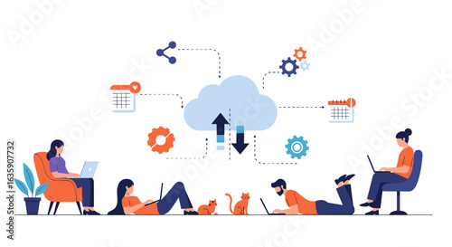 collaboration, technology, network, cyberspace, information, storage, upload, download, sync, teamwork, communication, online, workspace, productivity, efficiency, access, file, document, project, organisation, management, software, application, platform, service, virtual, environment, business, office, home, individual, people, device, laptop, illustration, icon, graphic, design, vector, modern, concept