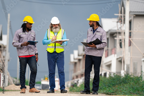 Team engineer building inspection use computer laptop and blueprint working at construction site. Teamwork discussing at workplace..