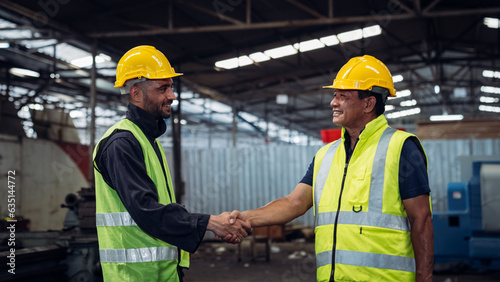 Team Engineer is shaking hands. Industrial worker in the factory. Engineer is maintaining in the warehouse.