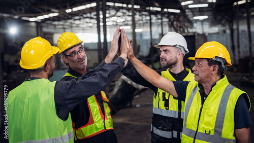 Team engineers and foreman stack hand and shake hands to show success at factory machines. Mechanical Team Operating Machinery.