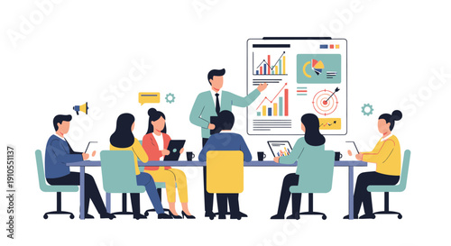 team, meeting, presentation, boardroom, conference, chart, graph, planning, discussion, business, collaboration, office, colleague, workspace, leader, strategy, teamwork, datum, dashboard, laptop, tablet, coffee cup, whiteboard, growth, target, communication, goal, business meeting, informative, optical