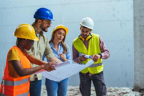 Team of construction workers discussing project details with executive supervisor holding blueprints and digital tablet. Team of architects and civil engineers inspecting construction site.
