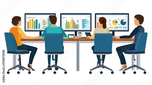 Team of Professionals Analyzing Data on Multiple Computer Screens in Modern Office Environment