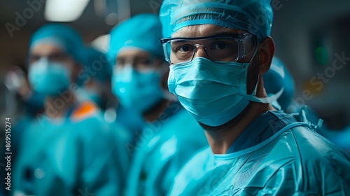 Team of surgeons in the operating room, wearing surgical masks and gowns, representing medical expertise and healthcare. Perfect for themes of medicine, surgery, and healthcare professionals.