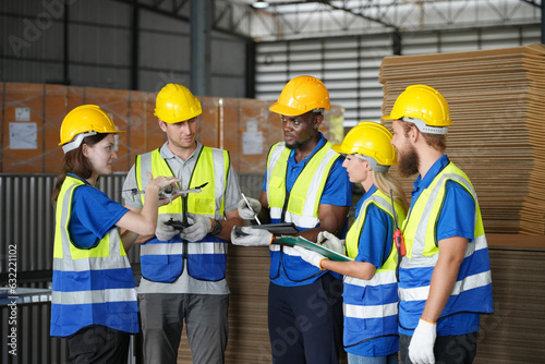Team of warehouse employees working on inventory in a large distribution warehouse. Business factory industry concept.