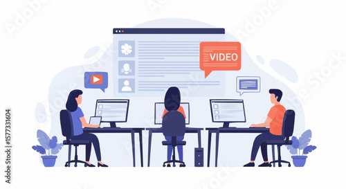 Team Working on Business Video Content – Flat Vector Illustration of Marketers Creating Ads and Social Media Posts on Computers