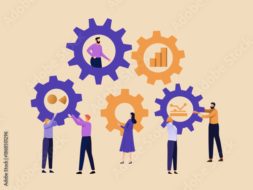 Teamwork and collaboration concept with people interacting with gear mechanisms
