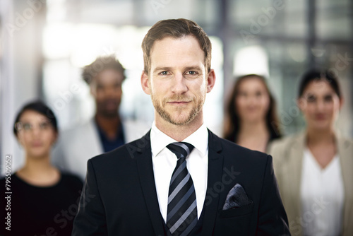 Teamwork, business people and portrait of man in office for partnership, collaboration and about us. Professional lawyers, diversity and men and women with confidence, company pride and leadership