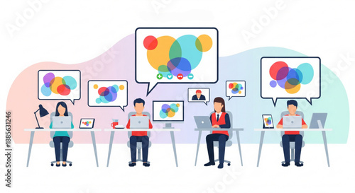 teamwork collaboration brainstorming digital workspace laptops speech bubbles creative communication illustration