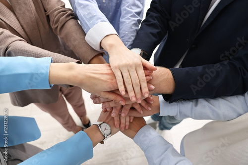 Teamwork. Group of people joining hands together indoors, above view