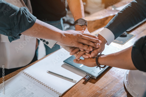 Teamwork of Construction business concept. Architect with Engineers are helping to design work on blueprints and collaborate on structural analyzing of project types.