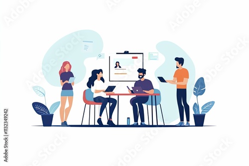 teamwork, collaboration, meeting, office, co-worker, professional, discussion, project, brainstorming, presentation, planning, strategy, digital, technology, device, tablet, laptop, computer, communication, interaction, connection, workplace, modern, design, illustration, graphic, flat, style, business, employee