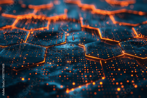 tech background wallpaper 3D holographic hexagonal patterns with pulsing light trails, set against a dark, futuristic backdrop with subtle data streams.