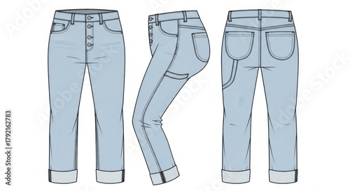 denim, jean, technical, fashion, illustration, trousers, garment, apparel, clothing, design, sketching, drawing, blueprint, template, style, casual attire, modern, wear, fabric, pant, artwork, vector, cotton, silhouette, light, blue, buttons, pocket, front, side, back, view, relaxed, cuff, cropped, trendy, stitching, feminine, female, lady, woman, collection, seasonal, clothes rack