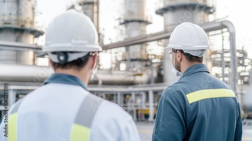Technicians wearing hard hats and protective gear working in a refinery s highpressure area protective gear, refinery workers, safety