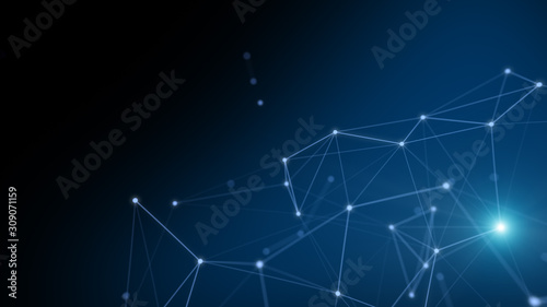 Technology network and communication with line and dot moving with transfer information data line and dot on blue background.