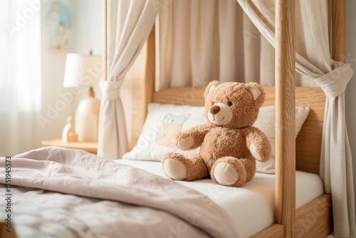 teddy, bear, sitting, wooden, bed, white, sheet, airy, bright, canopy, room, toy, cute, home, bedchamber, soft, pillow, children, childhood, baby, interior, furniture, apartment, background, love, little, object, design, house, blanket, boy, blue, modern, small, wall, children, gift, stuffed, sleep, brown, animal, bedchamber, clean, cushion, plush